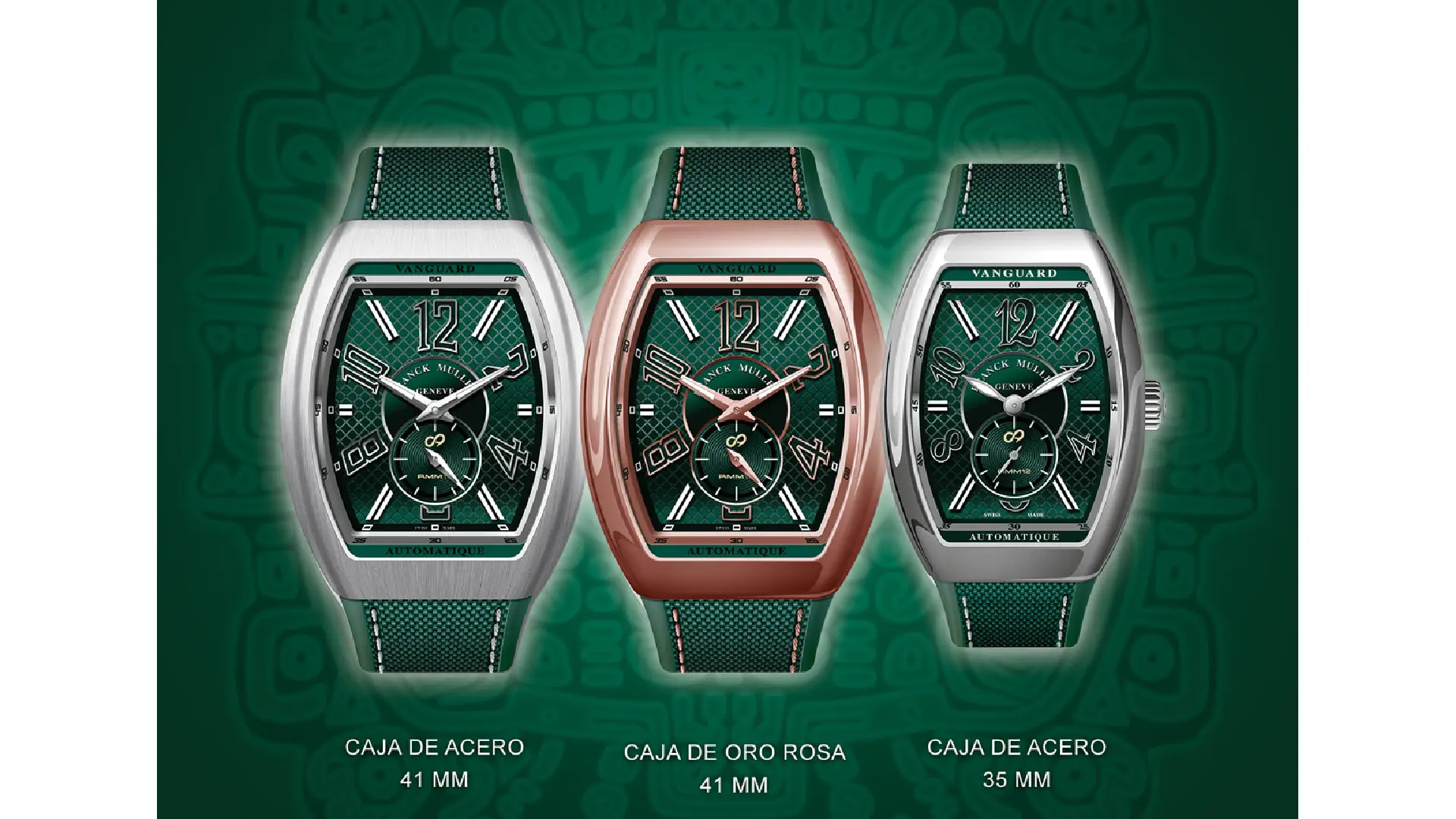 El reloj presenta una caja Vanguard Slim de acero satinado, de líneas curvas y laterales robustos que refuerzan una sensación de solidez y presencia deportiva. La carátula en verde profundo inspirada en el jade de la cultura maya, trabajada con un patrón guilloché geométrico inspirado en la rejilla Bentley, no es un color unidimensional.
