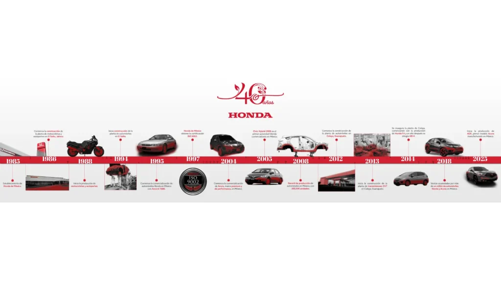 Honda conmemora cuatro décadas de presencia continua, inversión y desarrollo en México. Desde que Honda de México, S.A. de C.V. se estableció el 10 de septiembre de 1985, ha consolidado su compromiso a través de dos instalaciones de manufactura. Aquí un breve repaso de su historia.