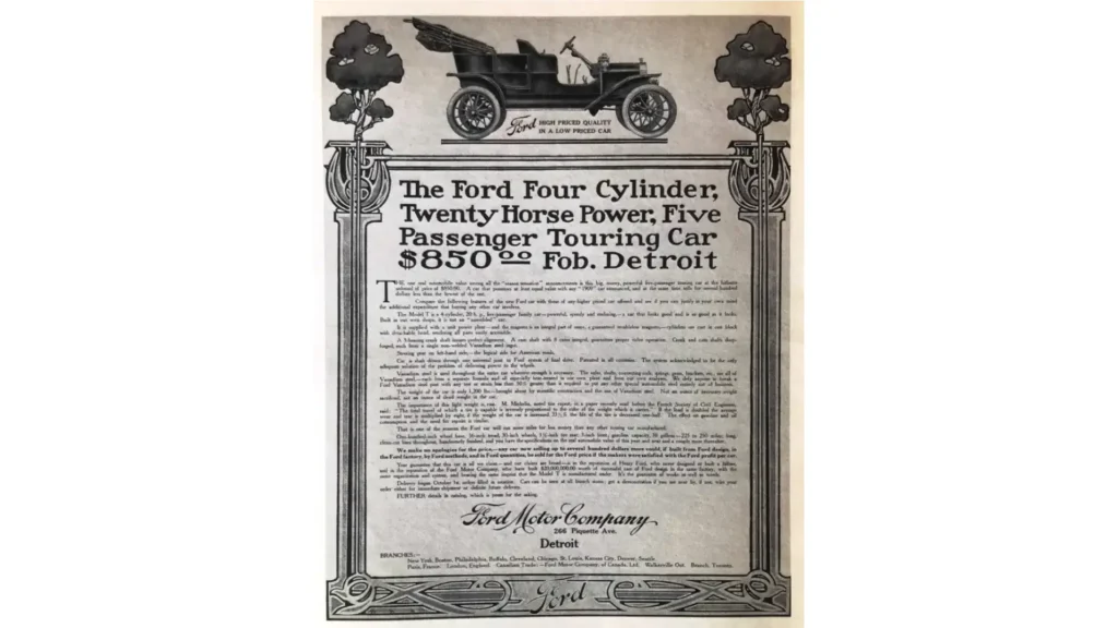 Un gran ejemplo de la evolución de la publicidad de Ford fue la campaña del Modelo T, que se presentó por primera vez en 1908. Aunque Henry Ford solía decir: “Si tienes algo realmente bueno, se anunciará solo”, al principio la compañía cedió y echó mano de la publicidad. Durante los 19 años que el modelo estuvo activo, hubo un sinfín de publicaciones impresas que se adaptaron al constante cambio del mercado.