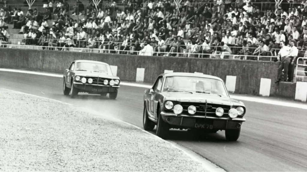 La historia del Mustang en el automovilismo comenzó en 1964 durante el Tour de France, una competencia de ocho carreras, diez días y 3,500 millas que había sido dominada previamente por Jaguar.